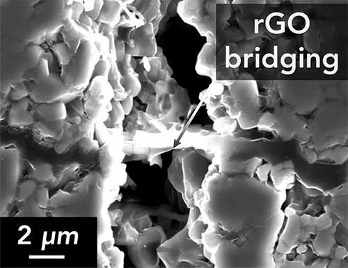 力學(xué)測試表明,復(fù)合材料的韌性比單純的陶瓷提高了兩倍以上。Athanasiou 說:“當(dāng)裂紋在材料中開始擴(kuò)展時,石墨烯能將裂紋表面固定在一起,這樣裂紋擴(kuò)展就需要更多的能量。”實驗還表明,只要確保在陶瓷中添加的石墨烯是適量的,就不會影響材料的電學(xué)性質(zhì),同時又能達(dá)到增韌效果。